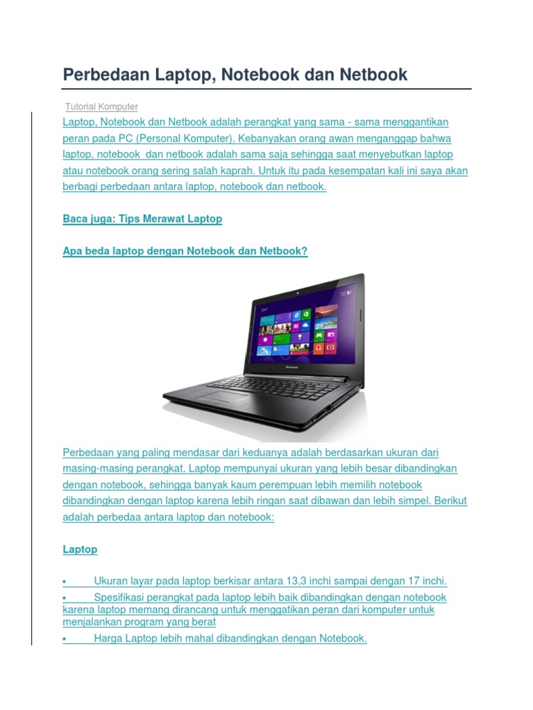 Tapi jangan salah spacer, masih nah, biar tak salah kaprah lagi, mari simak penjelasan ketiga perbedaan istilah teknologi tersebut. Sebenarnya, laptop dirancang tanpa meninggalkan berbagai macam aspek yang dimiliki oleh perangkat komputer. Dua perbedaan utama antara laptop dan notebook saat ini ditemukan pada masa pakai baterai dan berat: Daftar harga laptop (tipe laptop: Harga laptop merupakan harga device penting yang selalu dipertimbangkan banyak kalangan.