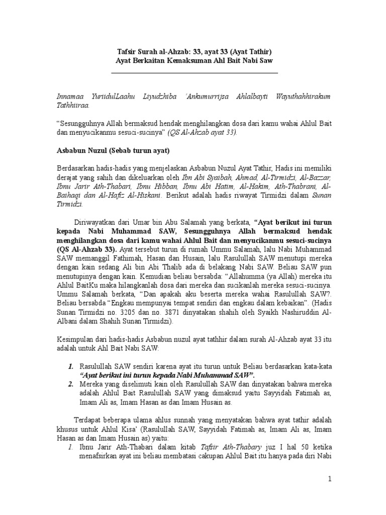 Regarding this sura ayat no 33 last part of the ayat refer to the wife of propheit muhammed and his family and frequently for his family but i think when muhammed (pbuh) took one sheet of blanket or something like this covered ali,fatima,hasan. يا أيها الذين آمنوا اتقوا الله وقولوا قولا سديدا. Pada ayat ini, allah menerangkan sikap dan tindakan kaum muslimin dalam menghadapi perang ahzab. لَقَدۡ كَانَ لَكُمۡ فِىۡ رَسُوۡلِ اللّٰهِ اُسۡوَةٌ حَسَنَةٌ لِّمَنۡ كَانَ يَرۡجُوا اللّٰهَ وَالۡيَوۡمَ الۡاٰخِرَ وَذَكَرَ اللّٰهَ كَثِيۡرًا. Sehingga mereka mengatakan boleh mengucapkan selamat natal asalkan ucapan selamat tersebut diniatkan untuk nabi isa, atau al qurthubi menjelaskan: